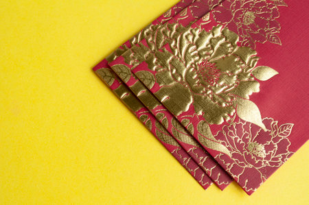 Top view of golden red envelopes on yellow cover with customizable space for text.