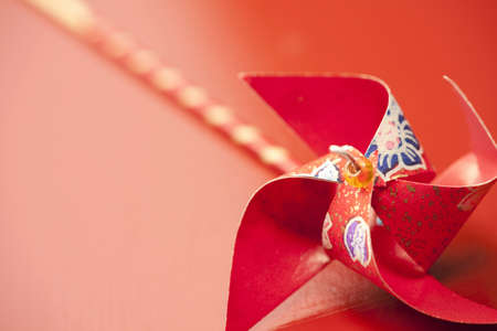 Chinese New Year. Decoration with traditional Chinese New Year motifs, cut out paper decorations on red cardboard background. Copy space.