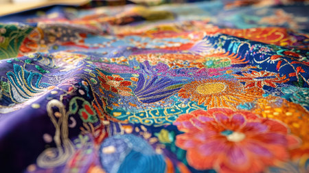 A vibrant close-up view of colorful embroidered fabric featuring intricate floral patterns. This textile showcases artistic craftsmanship and beauty.