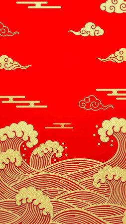 Chinese new year red background with clouds and waves. Vector illustration.