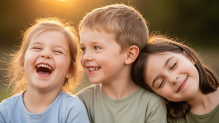 This image features three children smiling, illuminated by sunlight. The composition focuses on their faces, highlighting expressions of joy. The lighting suggests an outdoor setting, potentially during the day. This image could be suitable for a variety of uses, including editorial and commercial projects.
