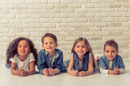 Cute little kids in stylish jeans clothes are looking at camera and smiling, lying on the floor against white brick wall