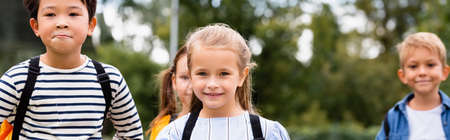 Smiling girl with backpack looking at camera near multiethnic friends on blurred background, banner