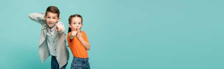 shocked girl in orange t-shirt covering mouth near boy pointing at camera isolated on blue, banner