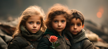 Multicultural little children sitting behind the fence. Homeless orphan stressful kids, education human right day concept