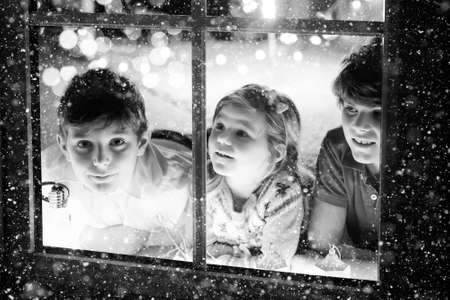 Three cute children sitting by window on Christmas eve. Two school kid boys and toddler girl, siblings looking outdoor and dreaming. Family happiness on traditional holiday