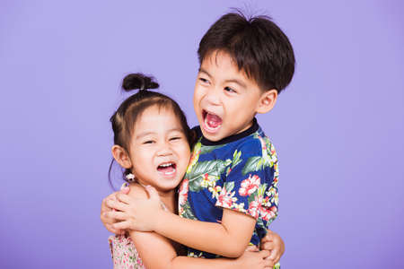 Asian Two happy funny little cute kids stand together in studio shot isolated on purple background, happy family brother and sister hugging each other feeling love (4 years old boy, 2 years old girl)