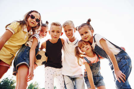 With soccer ball. Portrait of kids that standing together and posing for the camera.