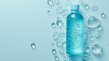AI Generated. Cold sparkling blue water bottle with glistening droplets