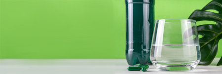 Liquid Chlorophyll Drink. Bottle and Glass with Green Chlorophyll Water, Chlorophyll powder and pills, healthy trendy vitamin beverage