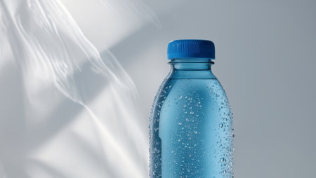 This minimalist image features a transparent water bottle with condensation set against a light and shadow backdrop, evoking a sense of purity and simplicity.