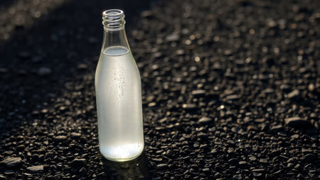 Condensation bottle. Clear glass bottle with cold beverage showing droplets of condensation on dark gravel surface with backlight.