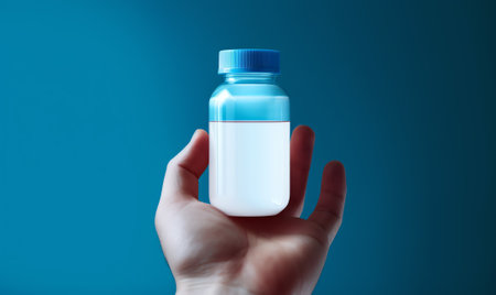 Generative AI : Male doctor in white uniform holding blue label white bottle of anti depressant drug pills close up