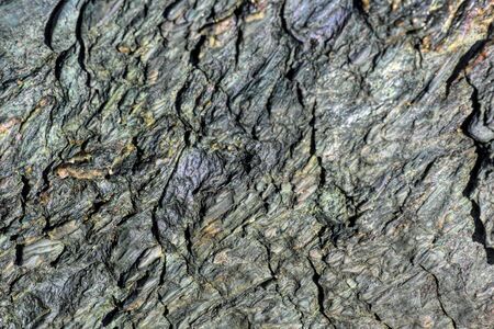 Background of sunlit weathered natural schist rock outdoors