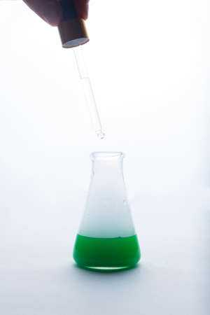 pipette, pipet, medicine dropper and Laboratory beaker with green liquid and smoke