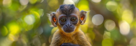 A young monkey with large, inquisitive eyes stares directly at the camera, its fur a soft brown against the vibrant green backdrop of the forest. The monkey's expression is both curious and slightly apprehensive, suggesting a playful interaction with the viewer.
