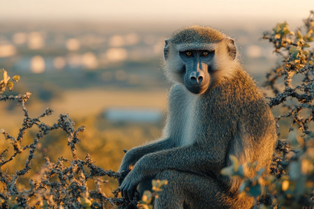 Baboon sunset savannah, Africa, wildlife, nature photography, stock image