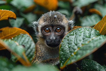 A close-up photograph of an adorable baby monkey peeking through wet green leaves in a tropical rainforest. the monkey's expressive eyes and the dewdrops on the leaves highlight the natural beauty and vivid detail of the wildlife habitat. Generative AI