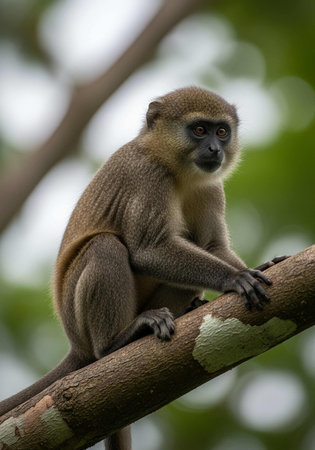 A curious monkey sits on a sturdy tree branch, observing its surroundings. This serene moment captures the beauty of wildlife in a natural environment.
