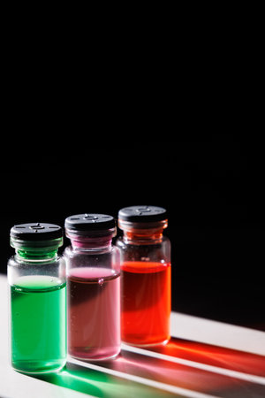 Vibrant glass medical vials with colorful liquids illuminated by a light beam reflecting on a marble surface against a dark black background today.