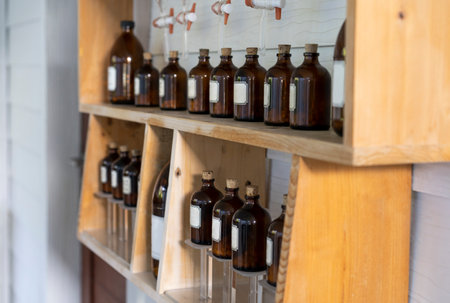 Vials with ingredients for self-preparation of cosmetics in a hotel in the Maldives.