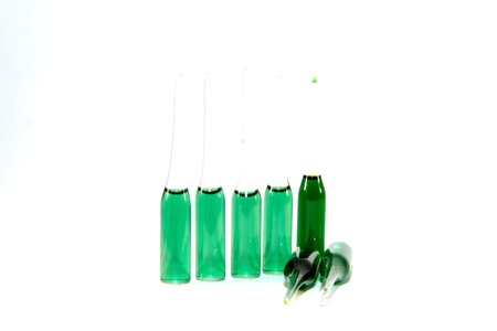 Glass medical ampoule vial for injection. Medicine is liquid sodium chloride with of aqueous solution in ampulla. Close up. Bottles ampule multicolor on background color and water. Human plasma.