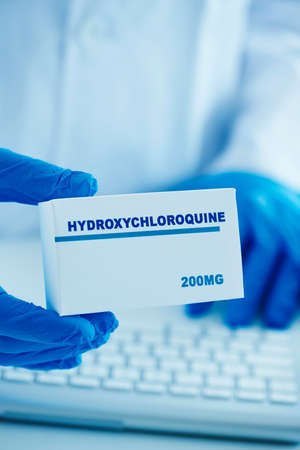 closeup of a man, wearing a white coat and blue surgical gloves, having a simulated box of hydroxychloroquine in his hands