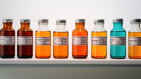 A vibrant display of colorful liquid samples in glass bottles arranged on a table in a laboratory setting, showcasing various scientific experiments and measurements.