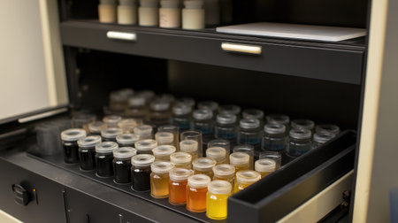 This image showcases a meticulously organized selection of glass jars filled with a variety of colorful liquids, ideal for laboratory analysis and experimentation.