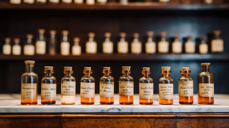 Retro pharmacy vintage pharmacy bottles on wooden board