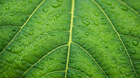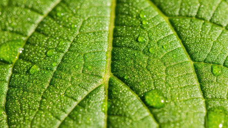 Extreme close-up of a vibrant green leaf surface with visible veins and numerous clear dew drops.