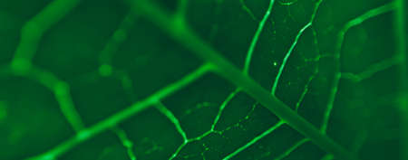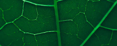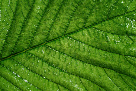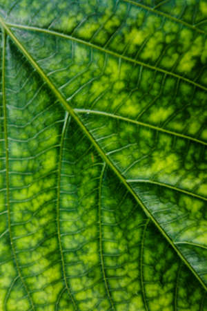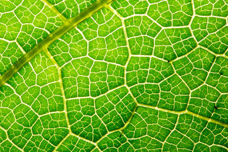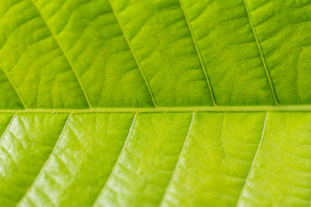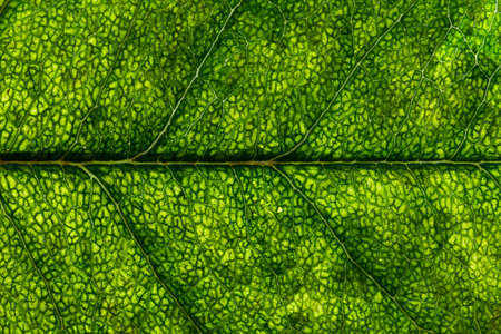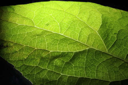 Closeup of portion of green netted veins leaf, reticulate venation of green leave with light.