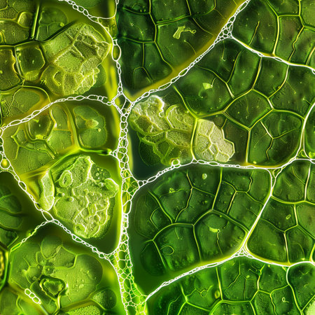 Close-up of green plant cells under a microscope, highlighting the detailed cellular structure and chloroplasts at work.