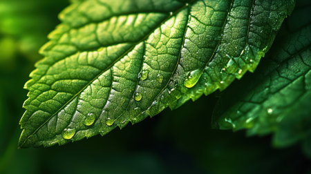 Close-up view of vibrant green leaves adorned with water droplets, showcasing intricate textures and a refreshing natural feel in a serene outdoor setting.