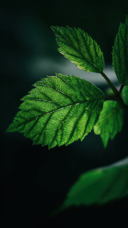 Bright green leaves are illuminated in soft light showing their intricate veins and vibrant color against a dark background.