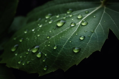 A close up macro image of a leaf with water droplets on it