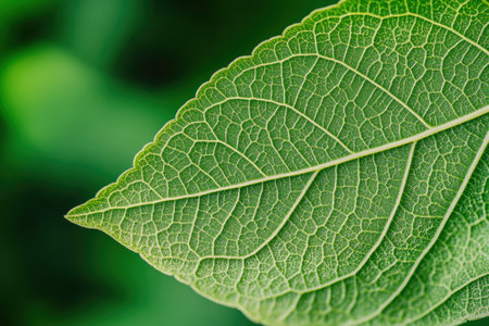 Focus on a vibrant green leaf showcasing intricate textures and patterns under natural light. The details highlight the leafs health and vitality.