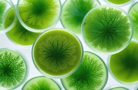 Algae, microalgae in petri dishes research in laboratories. biotechnology, science. Flat lay, top view. Macro. Biofuel research process in laboratory. Generative AI