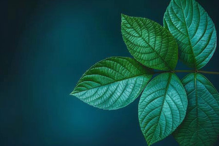 Green leaves on dark blue background. Nature background. Copy space.