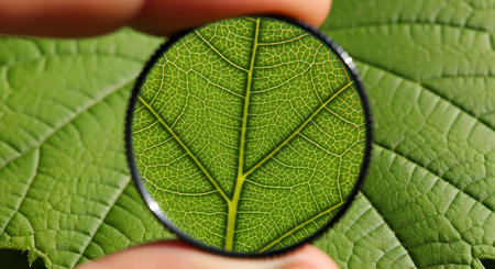 A magnifying glass held by fingers reveals the intricate network of veins on a vibrant green leaf. The image highlights the detailed structure and patterns of nature, symbolizing concepts like discovery, biology, and environmental science.