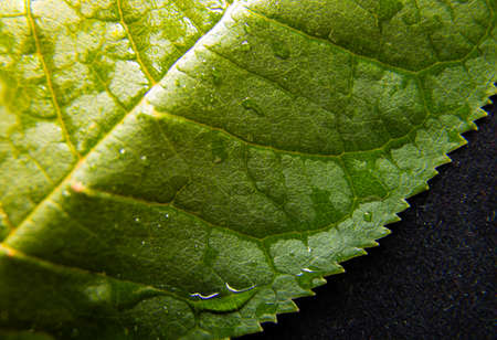 Green leaf macro close up. Natural background with water droplets.