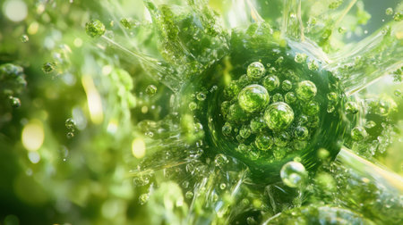Fantasy plant cells microscopy. Green organic structures. Microlife concept. Generative AI.