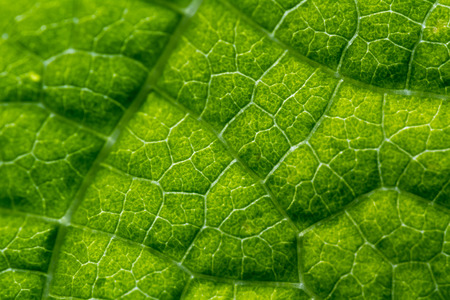 Backlit close up of the surface of a green leaf texture showing detailed veins. Nature or environmental background.