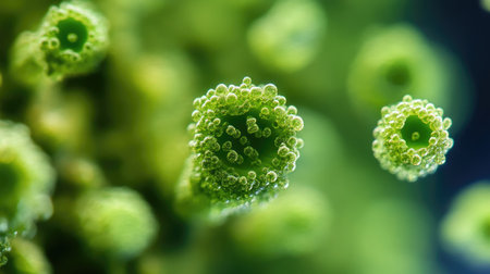 Small green microorganisms cluster together in a natural environment showcasing intricate details and textures in a vibrant display of life.