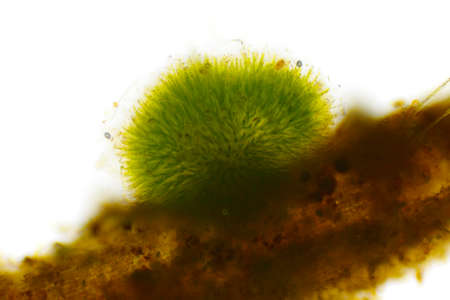 Spherical colony of cyanobacteria (Gleotrichia, blue-green algae). Side view, Brightfield illumination.