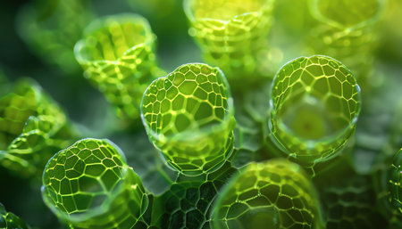 Microscopic view of green plant cells, detailed focus on cell structure, vibrant green tones