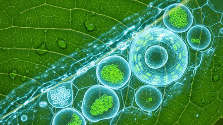 A scientific view of plant cells under a microscope, showcasing chloroplasts and the process of photosynthesis in a detailed abstract.