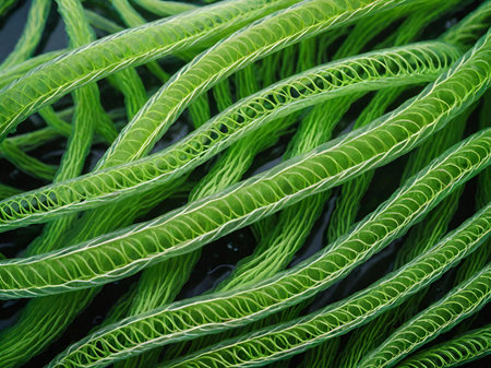 Microscopic view of vibrant green algae, close-up, biofuel concept, scientific detail.