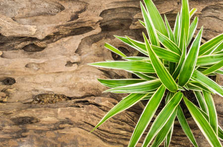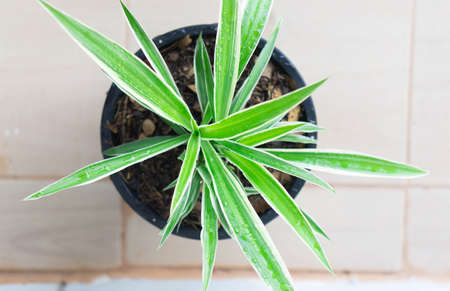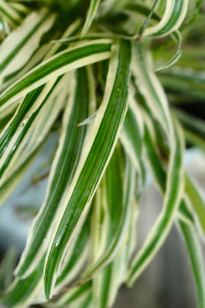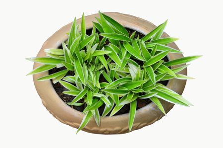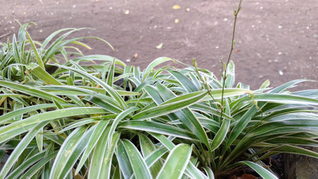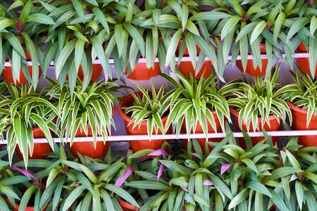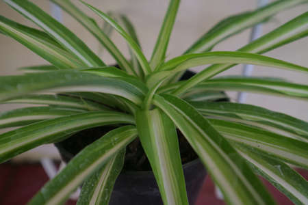 Closeup spider plant or Chlorophytum comosum in pot with water drop, Top view