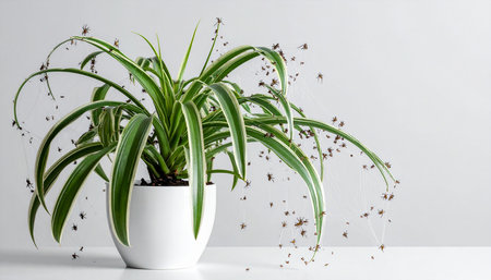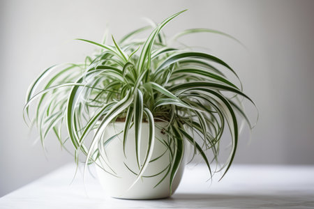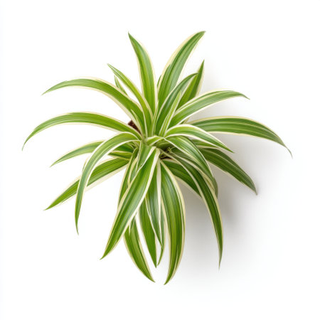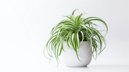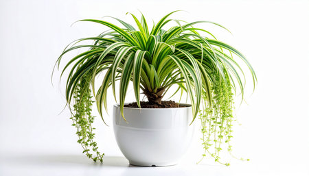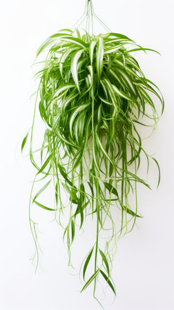 Stock image of a Spider Plant on a white background, arching leaves and tiny offshoots, airy and graceful Generative AI